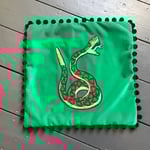 Cotton velvet in a choice of 3 colours with an embroidery snake patch, pom pom fringe and a metal zip closure 43cm x43cm